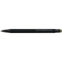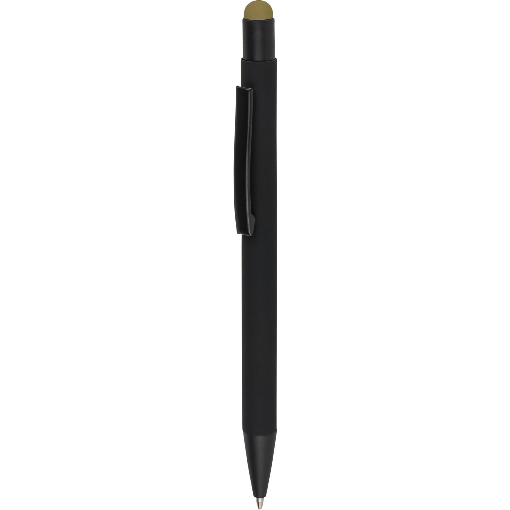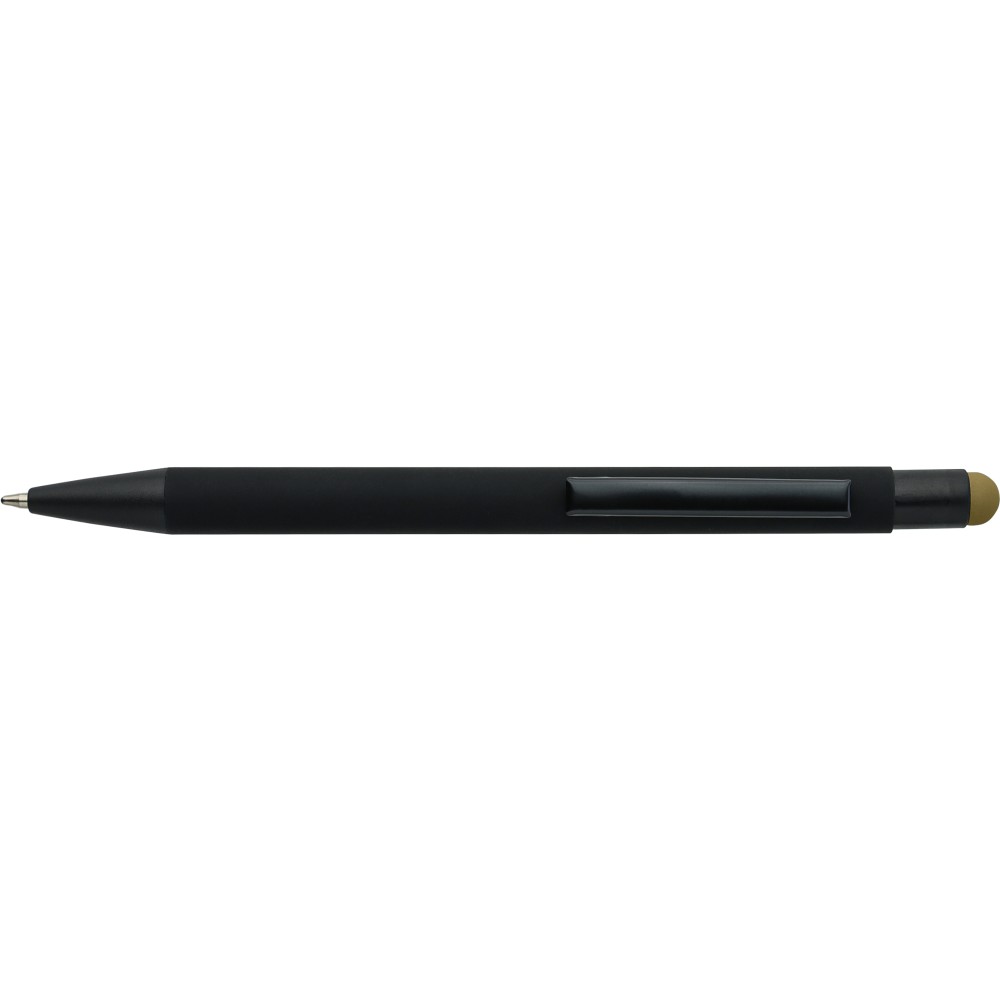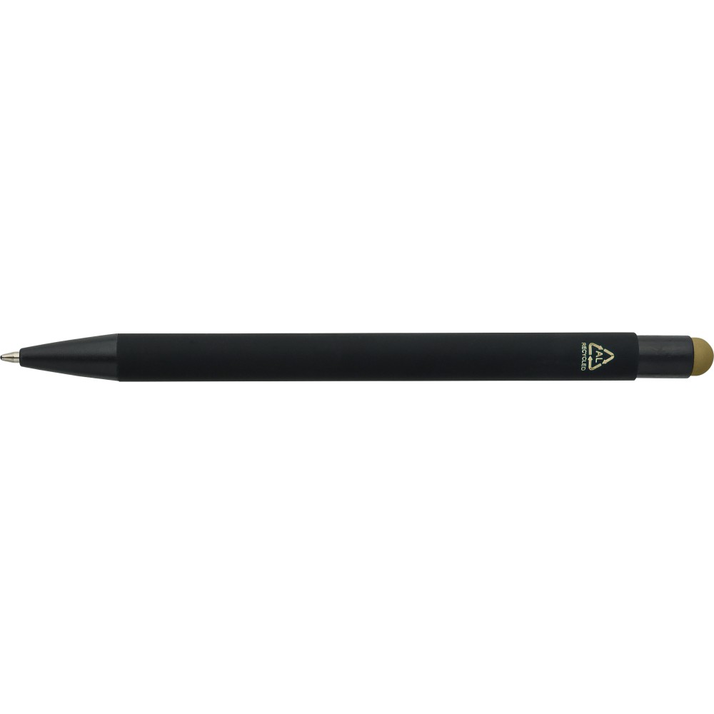 Újrahasznosított alumínium golyóstoll fekete, gumírozott felülettel és kék tollbetéttel. Színben illeszkedő kiegészítőkkel ? beleértve a belső tolltestet és az érintőképernyőkhöz használható stylus véget ?, amelyek kifinomult kontrasztot alkotnak gravírozáskor. Nyomógombos szerkezettel és gravírozott újrahasznosított logóval.