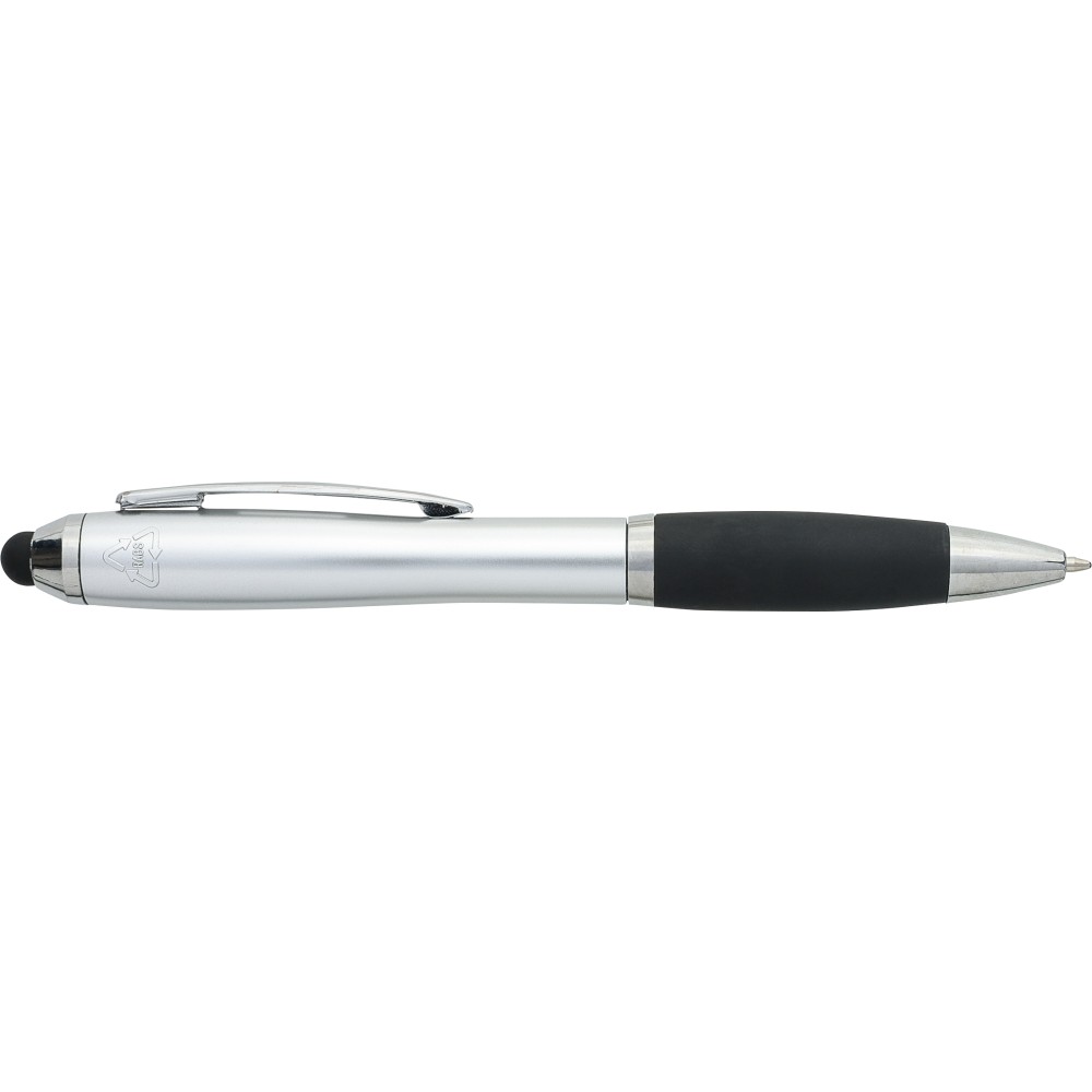 Golyóstoll egyszínű, gumírozott felületű testtel, ezüstszínű kiegészítőkkel és fekete, kapacitív érintőképernyőkhöz használható stylus véggel. Újrahasznosított ABS-ből készült. Nyomógombos szerkezettel, kék tollbetéttel és a tolltesten gravírozott újrahasznosított logóval rendelkezik.