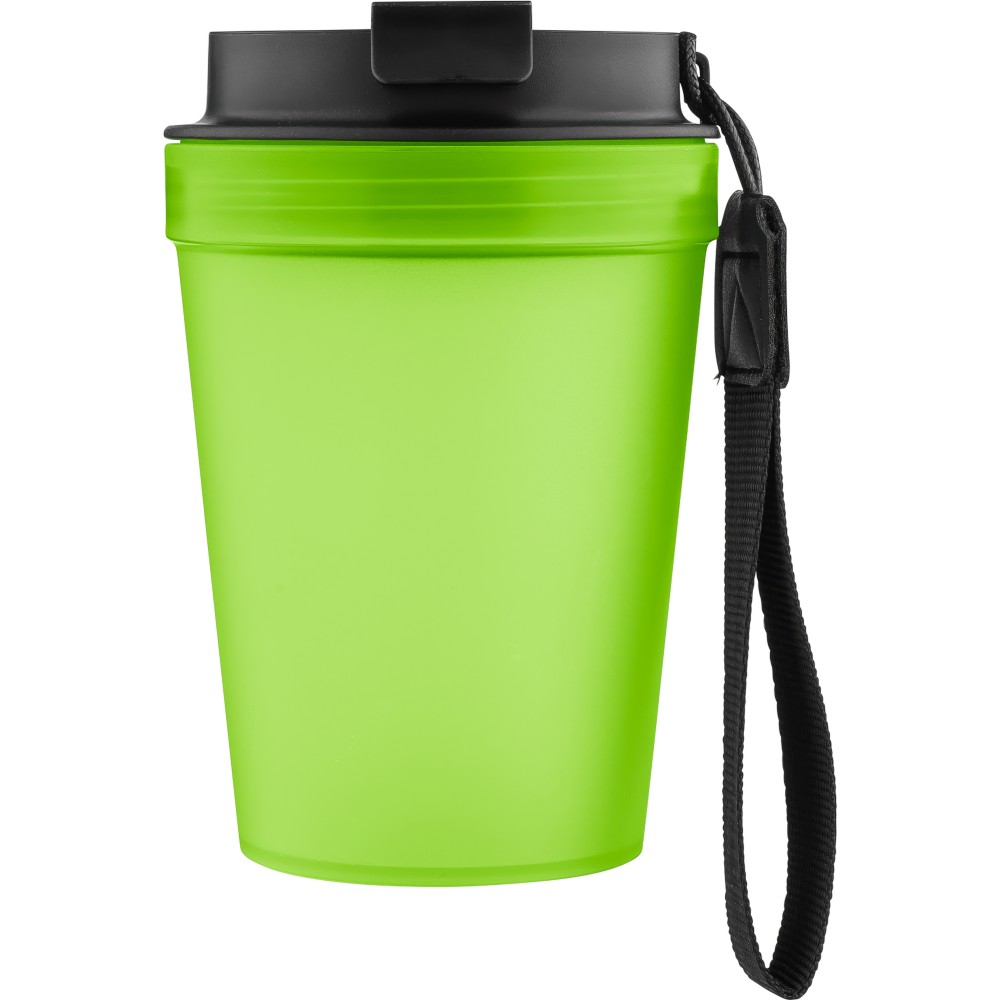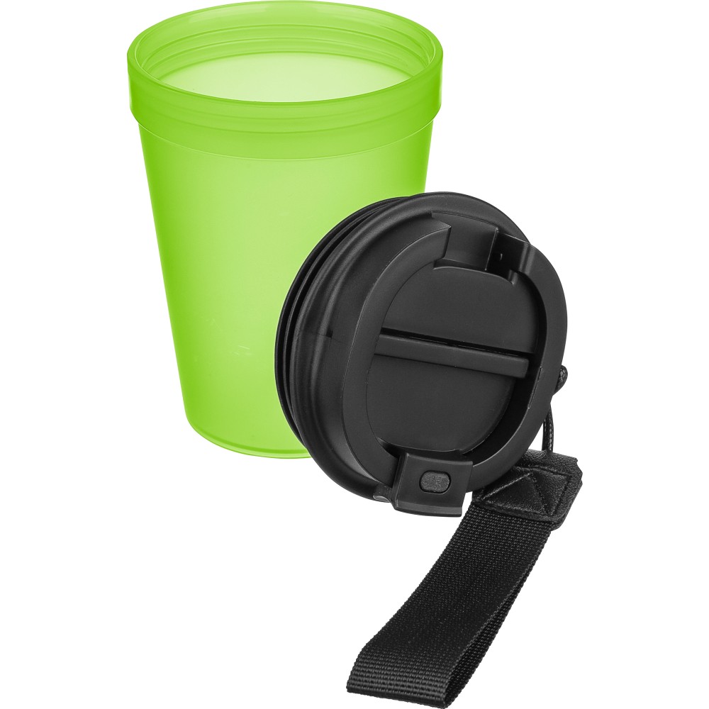 Átlátszó, szimplafalú ivópohár 350 ml-es űrtartalommal, vastagfalú kialakítással. Csavaros fedéllel és poliészter csuklópánttal rendelkezik a könnyű hordozhatóság érdekében. Tartós, ütésálló, megbízható termék. Meleg italokhoz is alkalmas, de kérjük, vegye figyelembe, hogy az egyfalú szerkezet miatt hőátadás előfordulhat.