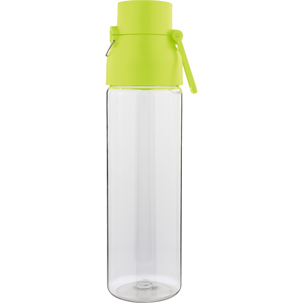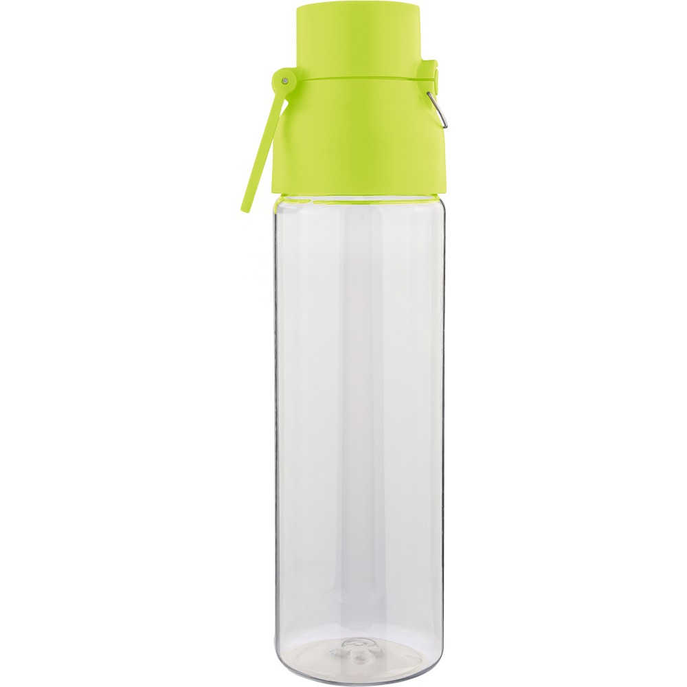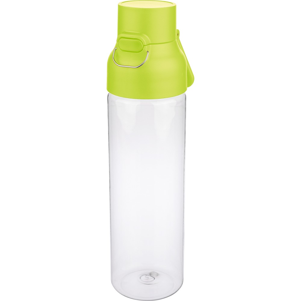 Tritán vizespalack 750 ml-es űrtartalommal, átlátszó palacktesttel és színes kupakkal. Tartós és könnyű anyagokból (PP) készült, amelyek ellenállnak a nedvességnek, a vegyszereknek és a mindennapi igénybevételnek. Mindennapi használatra tervezve; biztonságos nyomógombos zárral és felső hordozófogantyúval rendelkezik. Alkalmas munkához, iskolához vagy szabadtéri tevékenységekhez.