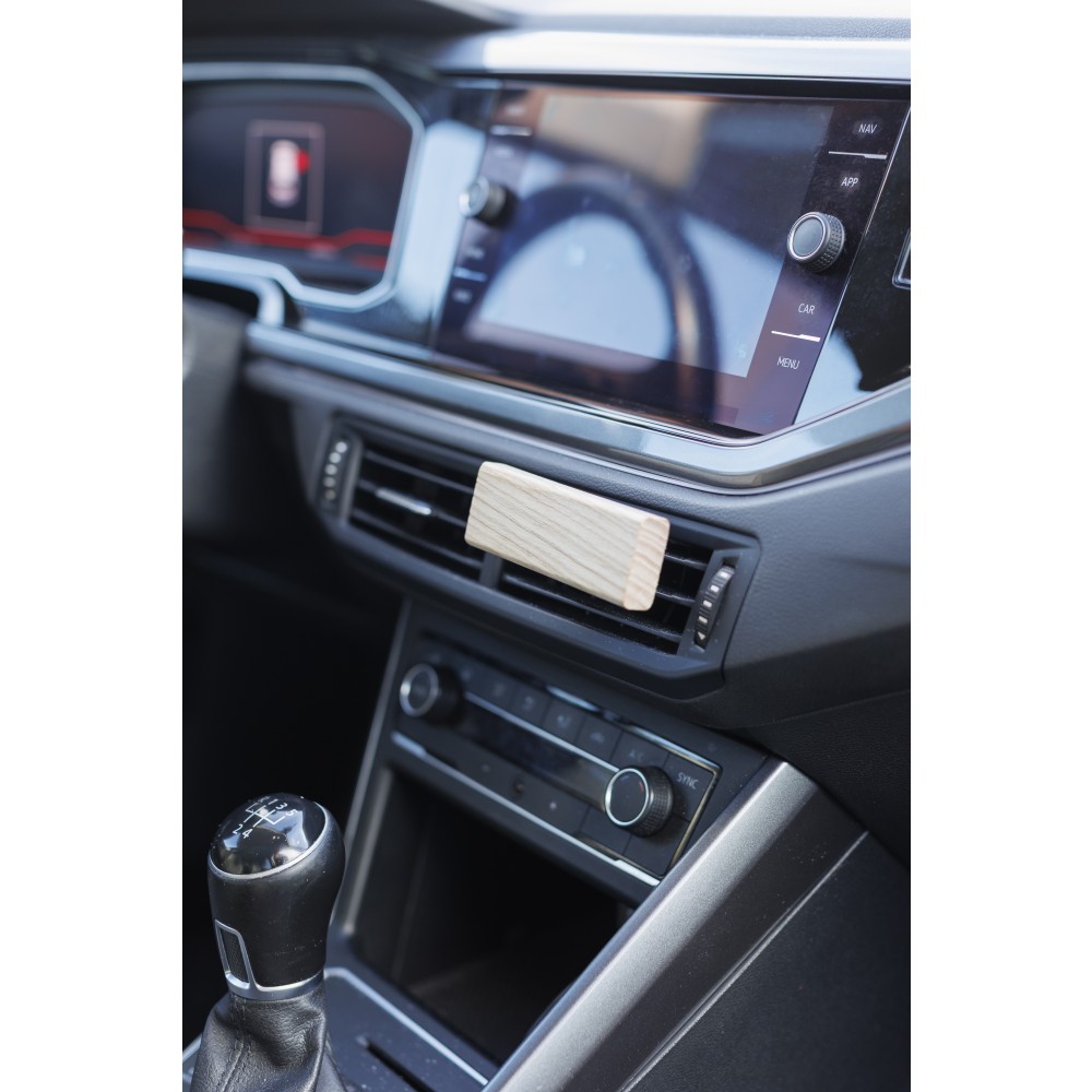 Natúr bükkfából készült autós légfrissítő, 2 × 3 g alkoholmentes szantálfa illattal (egy előre töltve, egy utántöltőként). ABS csipesszel ellátva a szellőzőrácsra történő rögzítéshez. Illusztrációval ellátott barna kartondobozba csomagolva. Emblémázás: Gravírozás, Tamponnyomás