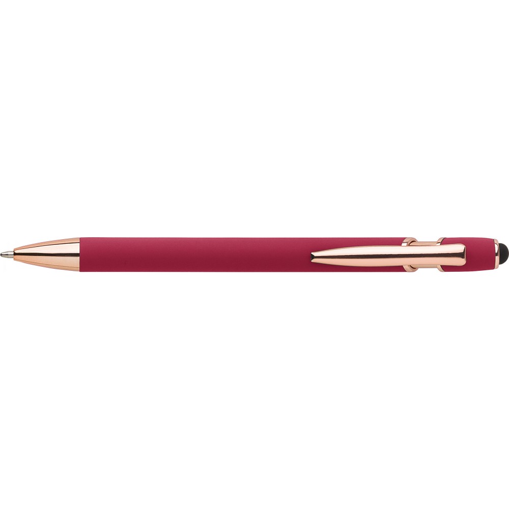 Alumínium golyóstoll rózsaarany részletekkel és érintővel, kék tollbetéttel. Emblémázás: Gravírozás, UV nyomtatás