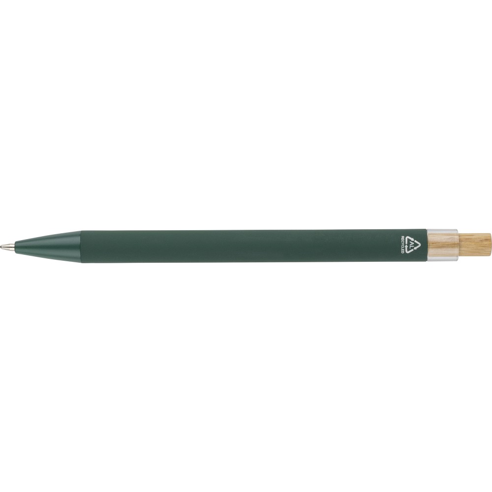 Újrahasznosított alumíniumból készült golyóstoll bambusz nyomógombbal és AS műanyag díszítéssel, fém klippel és a toll színével harmonizáló műanyag tollheggyel. A tolltesten lézergravírozott recycled (újrahasznosított) alapanyagra utaló logó található. Megközelítőleg 800 méter íráshosszúságú, kék színű tollbetéttel.