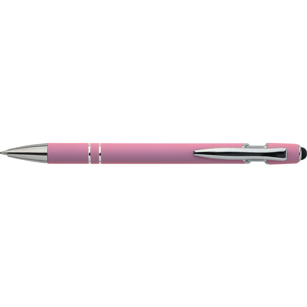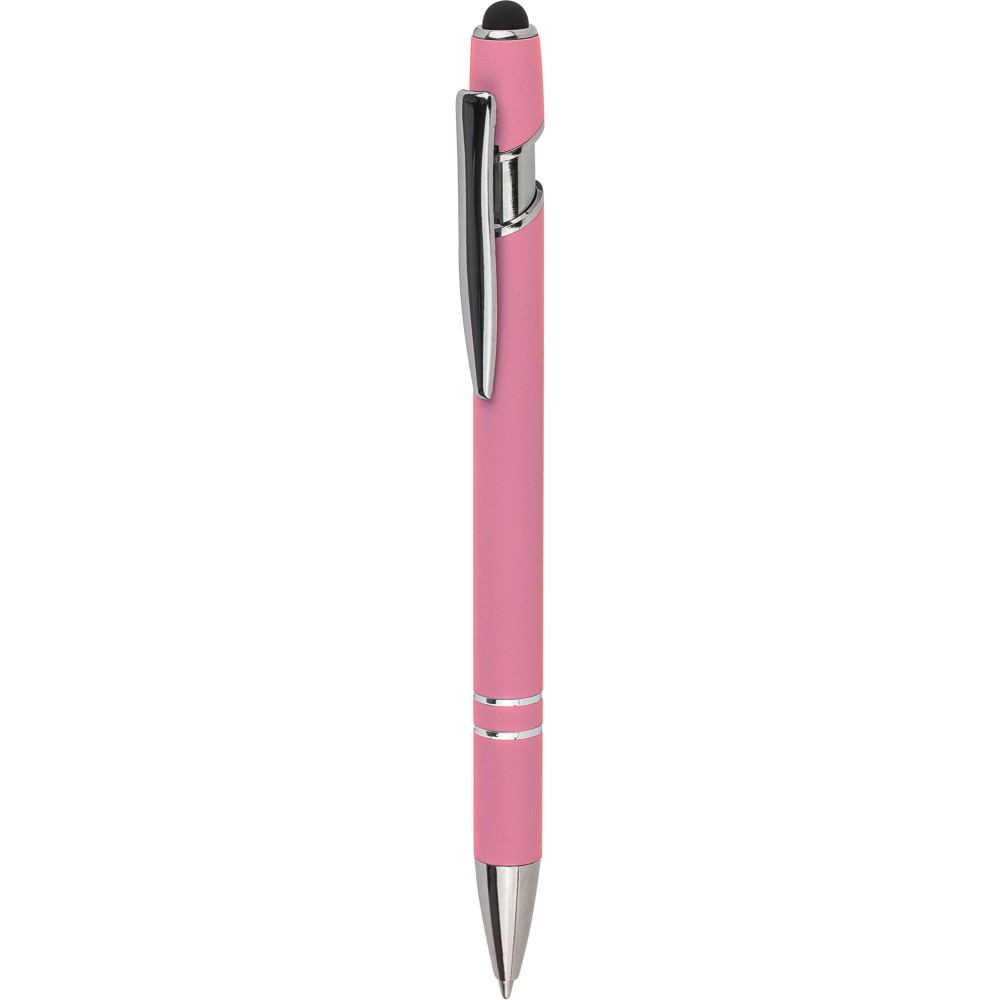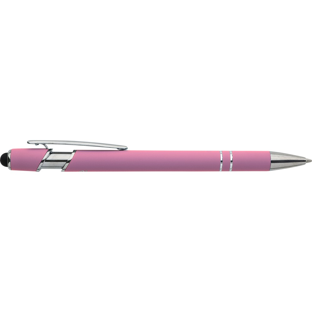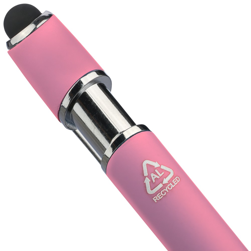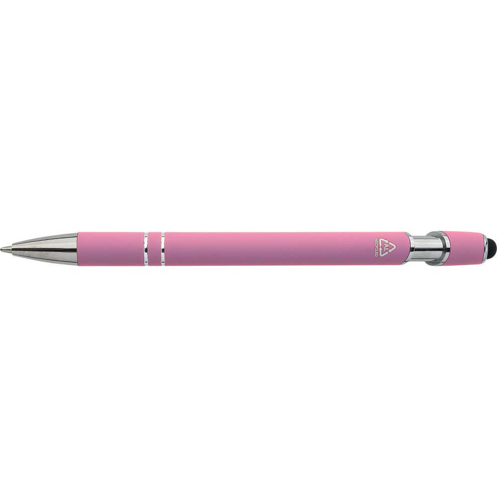 Újrahasznosított alumínium golyóstoll egyszínű, gumírozott felületű testtel és fekete, kapacitív érintőképernyőkhöz használható stylus véggel. Ezüstszínű kiegészítőkkel, nyomógombos szerkezettel és fekete tollbetéttel tervezve. A tolltesten gravírozott újrahasznosított logó található.