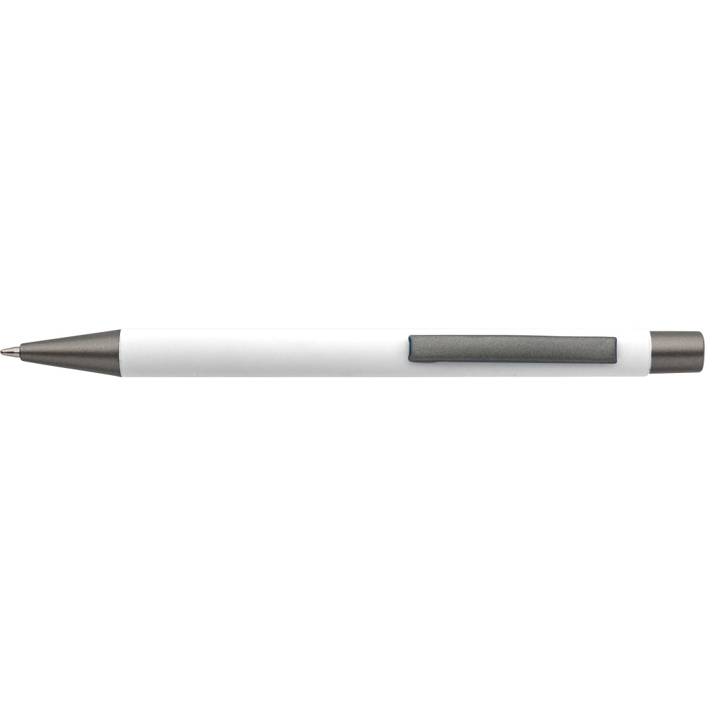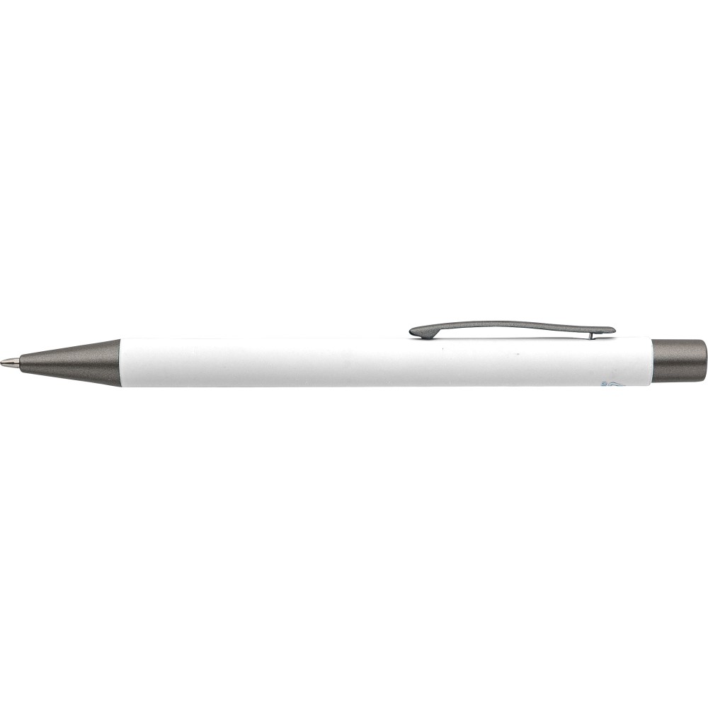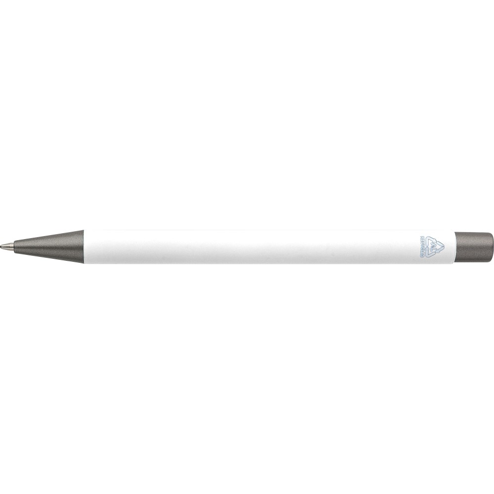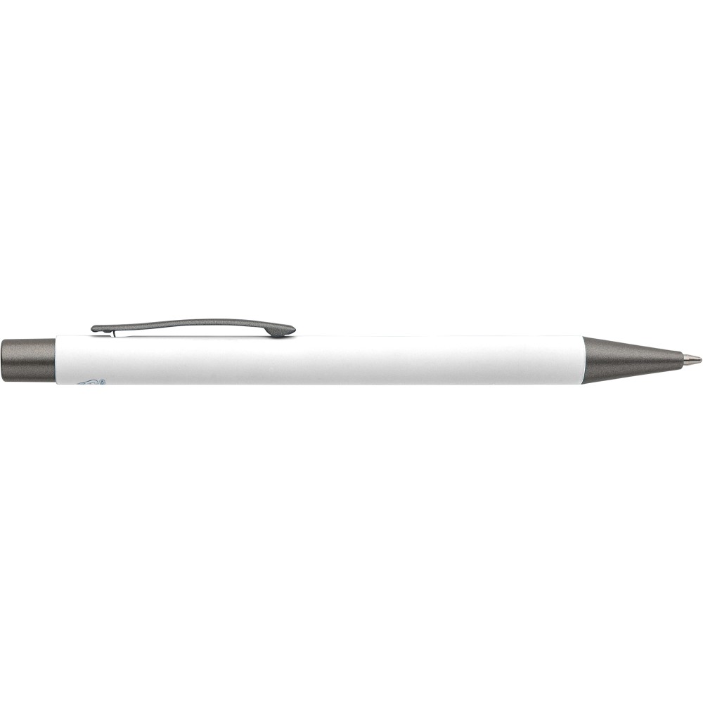 Újrahasznosított alumínium golyóstoll lágy tapintású gumírozott felülettel és kék tollbetéttel. Sötétszürke kiegészítőkkel és a bevonat alatti tükörhatású réteggel tervezve a látványos gravírozási eredmény érdekében. Nyomógombos szerkezettel és gravírozott újrahasznosított logóval.