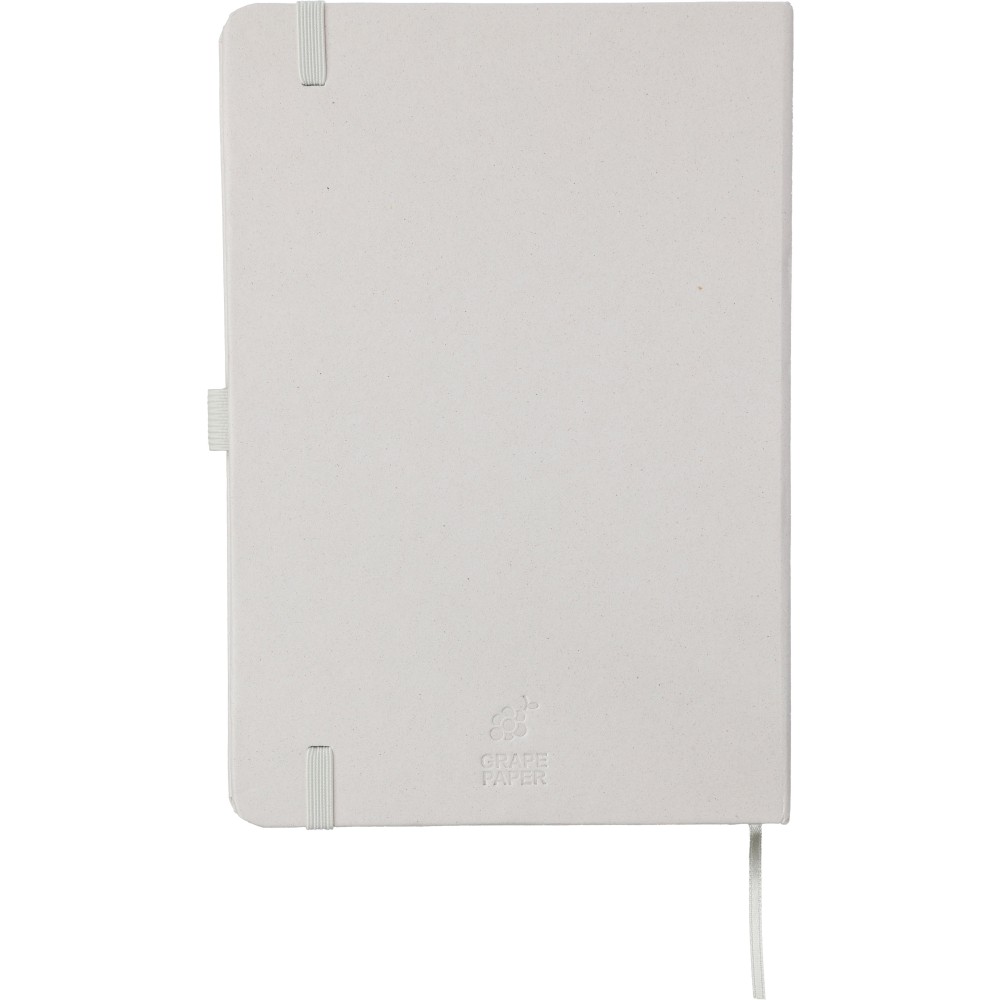 Újrahasznosított biohulladékból és kartonból készült A5-ös jegyzetfüzet 80 vonalas lappal, szójatintával nyomtatva. Minden füzet hátoldalán a hivatkozott alapanyag színének megfelelő dombornyomás található: zöld a citrusfélék, piros a cseresznye, kék a levendula, natúr a szőlő és a barna a mandula alapanyagra utal. A jegyzetfüzet olasz Favini papírral van bevonva. Emblémázás: Szitanyomás, Tamponnyomás