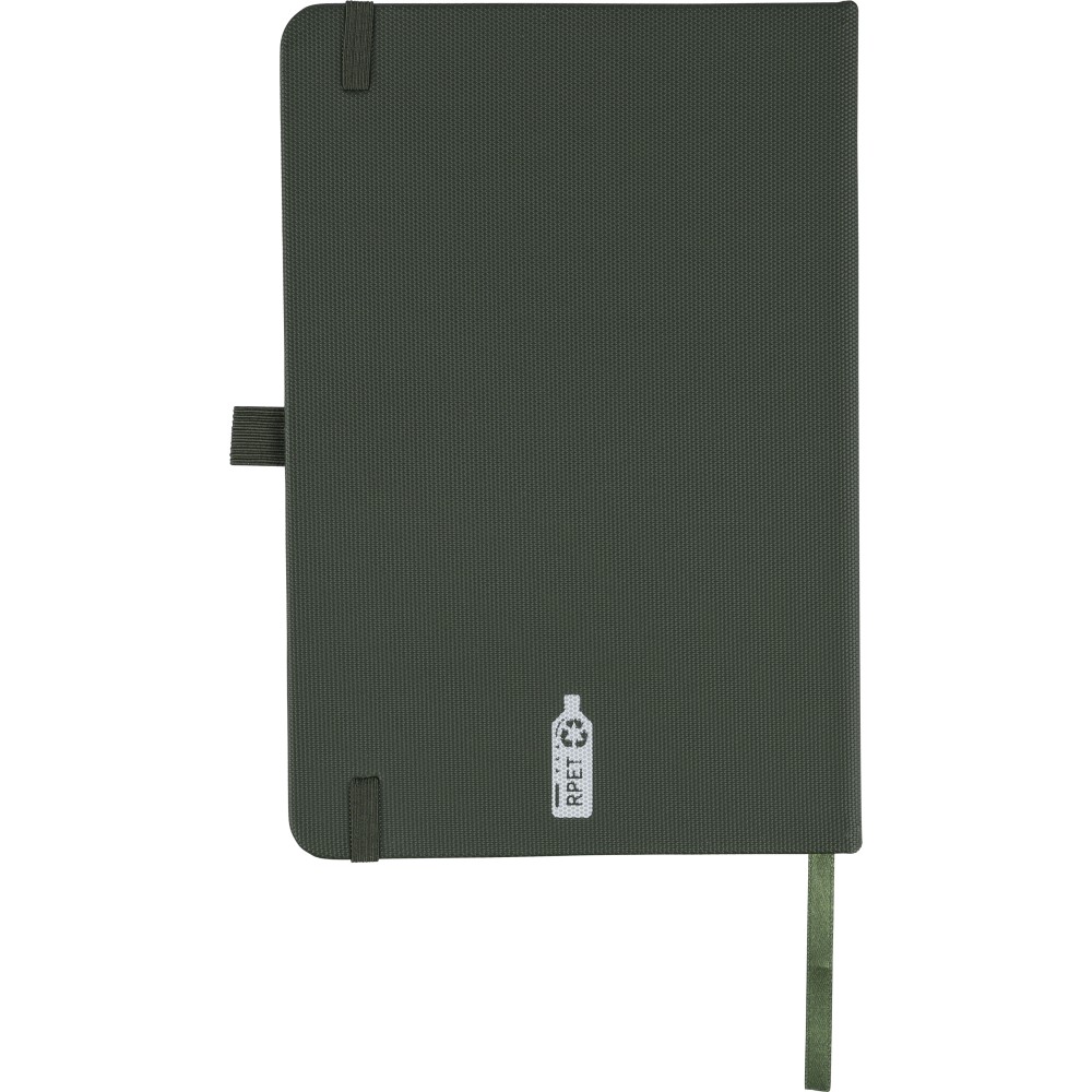 RPET 600D poliészterből készült, PU bevonatú, A5-ös jegyzetfüzet. 80 lap, 70 g/m2 vonalas papír, könyvjelző szalaggal, gumipánttal és tolltartó hurokkal. Félkemény borítású kialakítás. A hátoldalon dombornyomott recycled (újrahasznosított) alapanyagra utaló logó található.