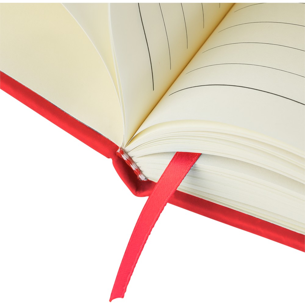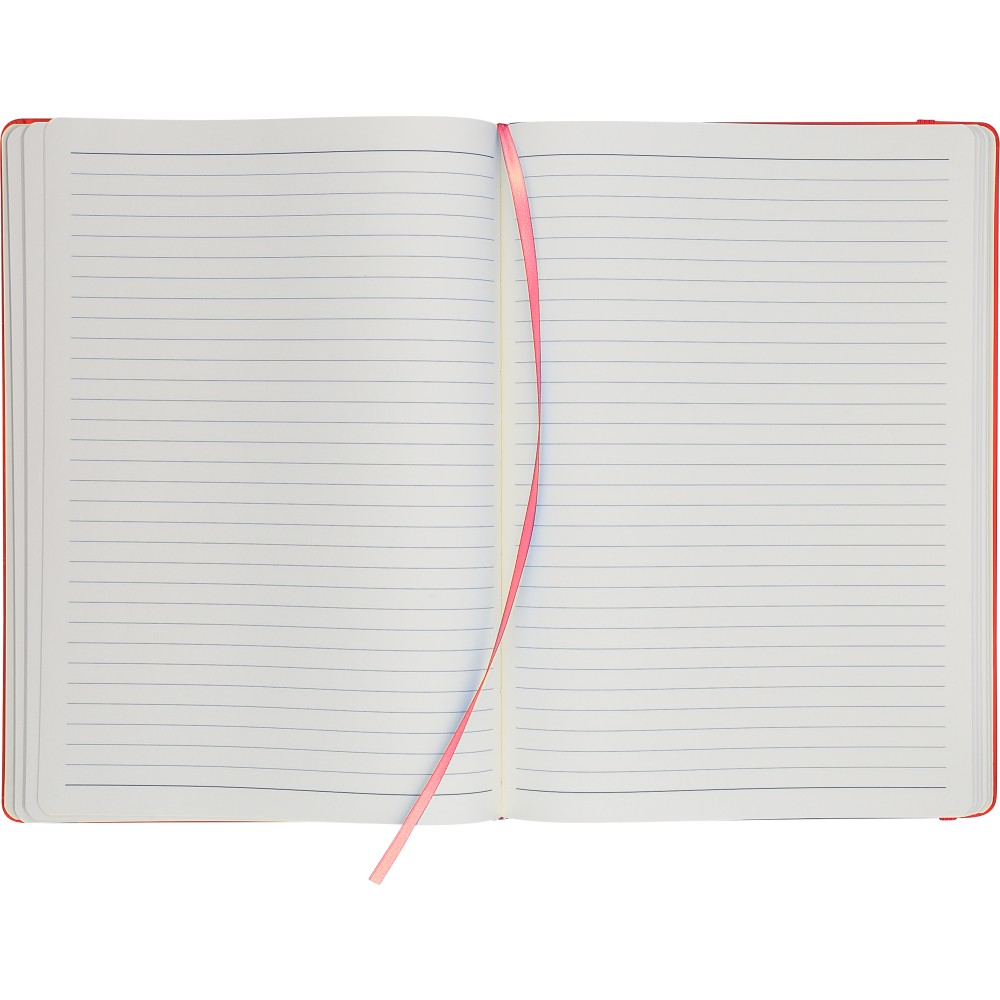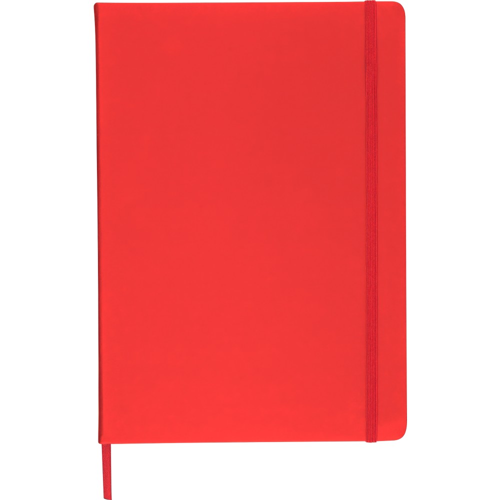 A4-es jegyzetfüzet élénk színű, újrahasznosított anyagból (PU) készült kemény borítóval. 96 db kétoldalas, vonalas lapot tartalmaz (6 g/m2), 0,7 cm-es vonalközzel, az elején és a végén két-két üres oldallal. A füzetben használt papír FSC Mix tanúsítvánnyal rendelkezik. Színben illeszkedő gumírozott rögzítőpánttal, beépített könyvjelző szalaggal és a hátoldalán dombornyomott újrahasznosított PU logóval ellátva.