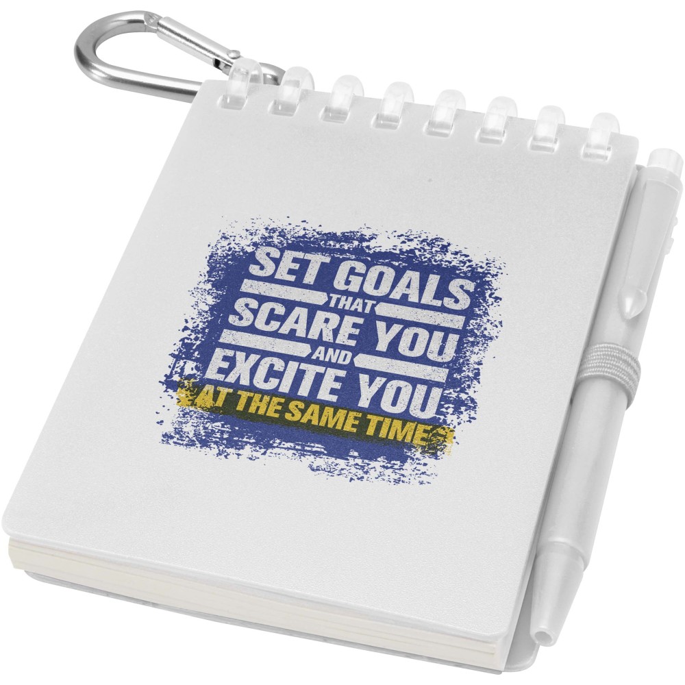 A Lig Mini jegyzetfüzet és toll szett kompakt és praktikus társ a gyors jegyzeteléshez útközben. A spirálfüzet puha, újrahasznosított műanyag borítással és 70 darab, 120 g/m2 súlyú, vízálló kőpapírból készült üres lappal rendelkezik, így ideális választás szabadtéri használatra is. A kerekített sarkokkal és beépített tolltartó pánttal ellátott kiegészítő tökéletesen követi a "mini" trendet, miközben teljesen funkcionális marad. A szetthez tartozó golyóstoll újrahasznosított ABS műanyagból készült, fekete tintával ír, íráshossza pedig 250 méter. A színben harmonizáló fémgyűrű segítségével a szett könnyen rögzíthető hátizsákra, táskára vagy kulcscsomóra, így tartós és hordozható megoldást nyújt a jegyzetek rögzítéséhez. A jegyzetfüzet mérete: 11 × 7,5 cm. Emblémázás: Szitanyomás, Tamponnyomás