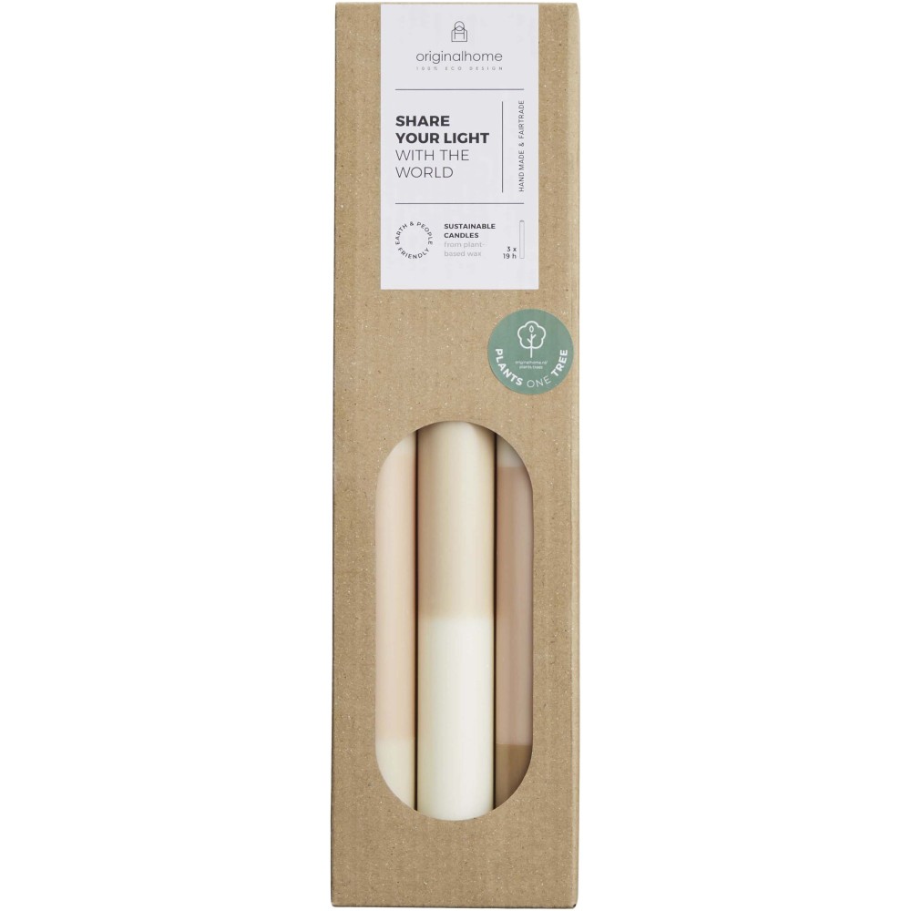 Ez a három darabból álló szett élénk színvilágú asztali mészkőgyertyákat tartalmaz, amelyek növényi alapú, paraffinmentes viaszból, kézzel készülnek. A termékek illatmentesek, 100% pamut kanóccal rendelkeznek, tiszta égést biztosítanak, darabonként 18-20 órás égési idővel. A gyertyák megvásárlása afrikai gazdák faültetési programjait, valamint egy indonéziai (Jáva) fair trade projektet támogatunk. Emblémázás: Matricázás