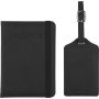 Újrahasznosított PU anyagból készült útlevéltartó és poggyászcímke, illusztrációval ellátott barna kartondobozban. Az útlevéltartó elülső oldalán "Passport" felirat található, belül két rekesszel az útlevél biztonságos rögzítéséhez. Mindkét terméken dombornyomott, újrahasznosított alapanyagra utaló logó található. Emblémázás: Szitanyomás