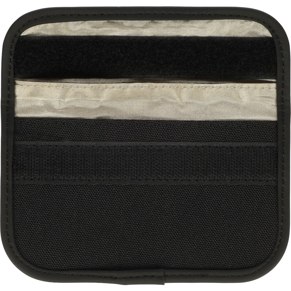 600D poliészter tok tépőzárral, kulcsok és kártyák tárolására tervezve. Újrahasznosított PET (rPET) és PU anyagból készült. Beépített RFID-védelemmel rendelkezik, amely megakadályozza az adathalászatot vagy a kulcsokhoz való illetéktelen hozzáférést. Belső kulcskarikát és tépőzáras fedelet tartalmaz.