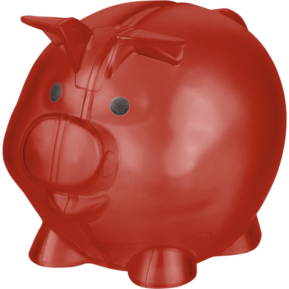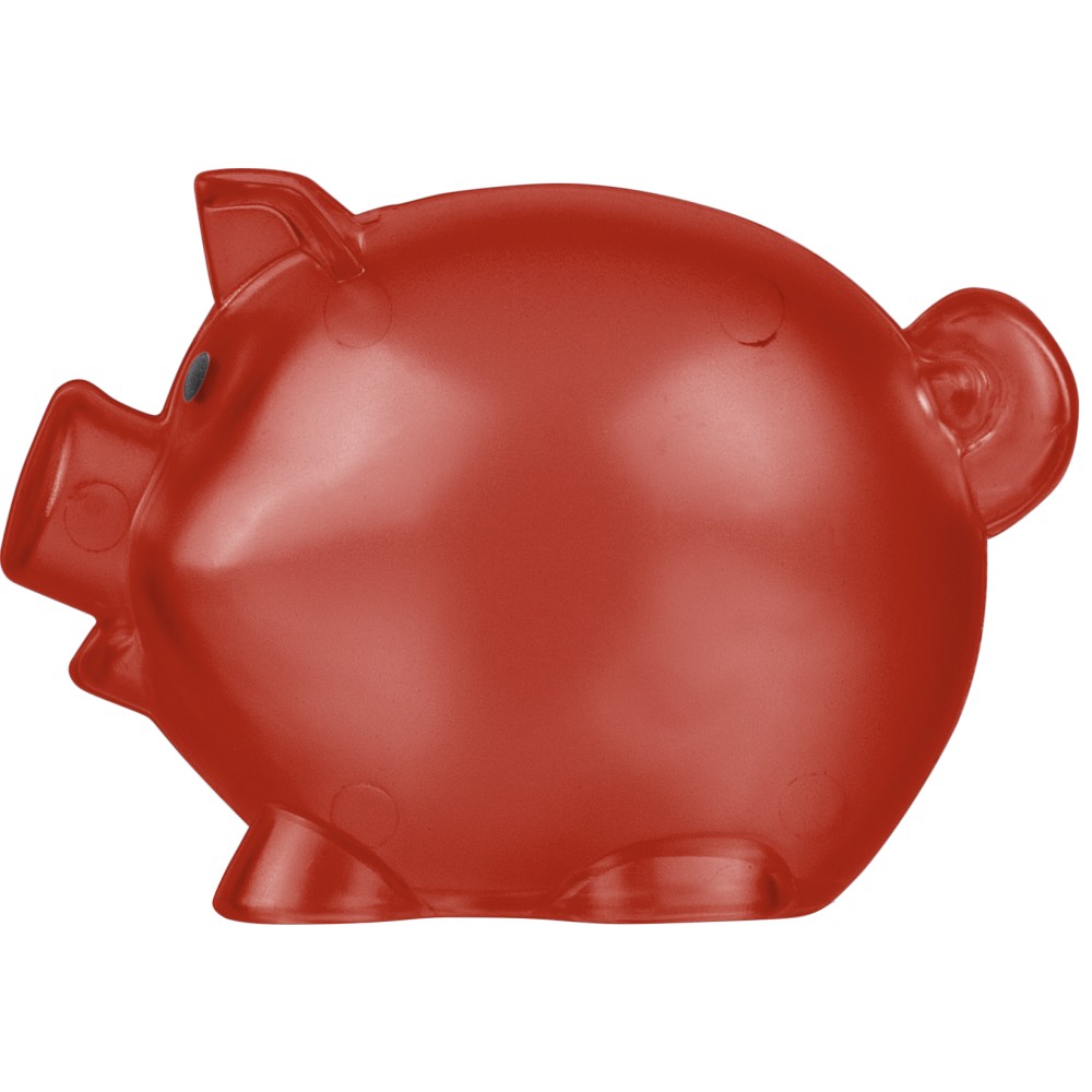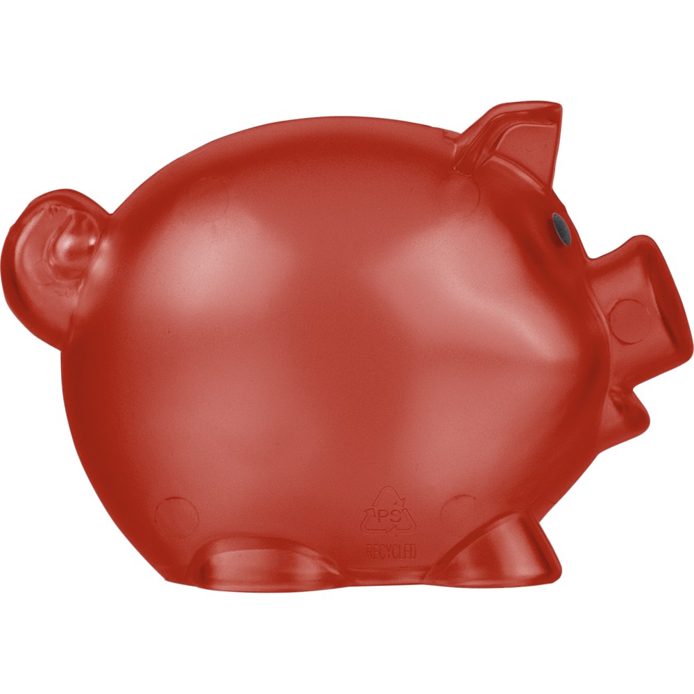 Újrahasznosított PS műanyagból készült, malacpersely. A hátoldalon recycled (újrahasznosított) alapanyagra utaló logó található. Emblémázás: Tamponnyomás