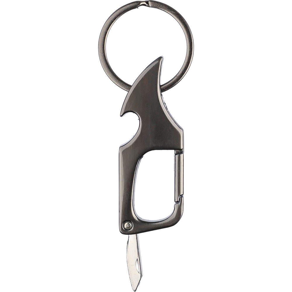 Karabiner kulcstartó sörnyitóval és kis késsel. A kulcstartó fém része elektrolizált. Egyenként barna papírzacskóba csomagolva. Anyaga: fém. Emblémázás: Gravírozás
