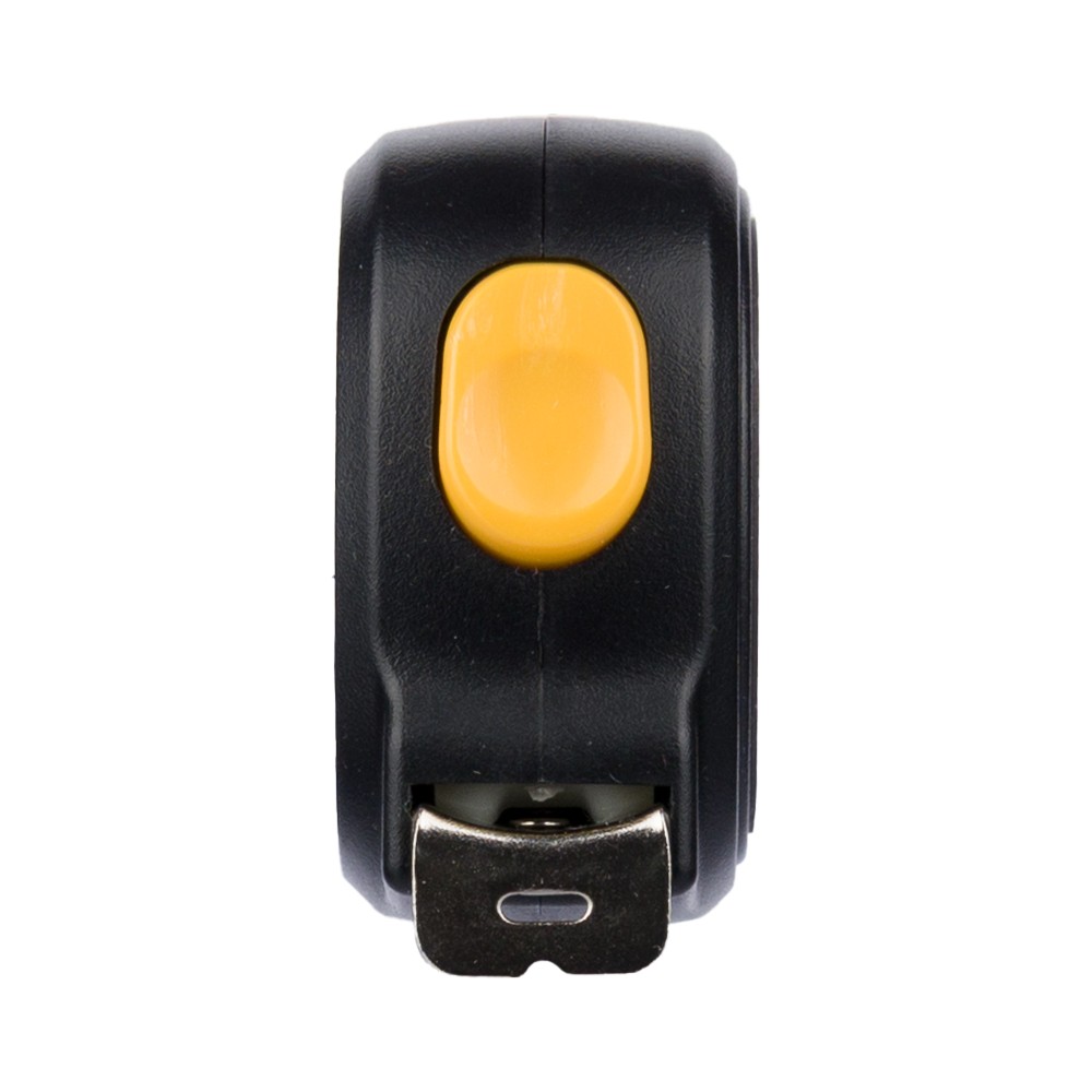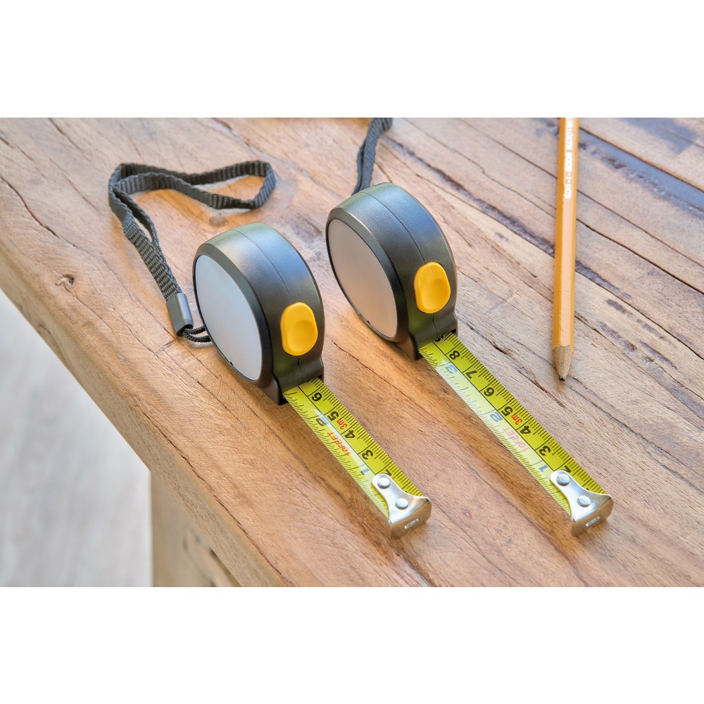 ABS műanyagból készült mérőszalag mágneses oldallal, 3 m hosszúságú és 16 mm szélességű fém szalaggal, centiméter- és inch-beosztással. Felül elhelyezett nyomógomb a rögzítéshez/kioldáshoz, valamint poliészter csuklópánt. Egyenként csomagolva illusztrációval ellátott barna kartondobozba. Emblémázás: Tamponnyomás