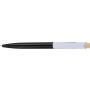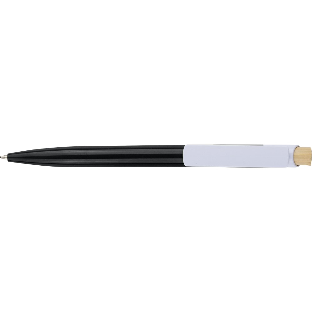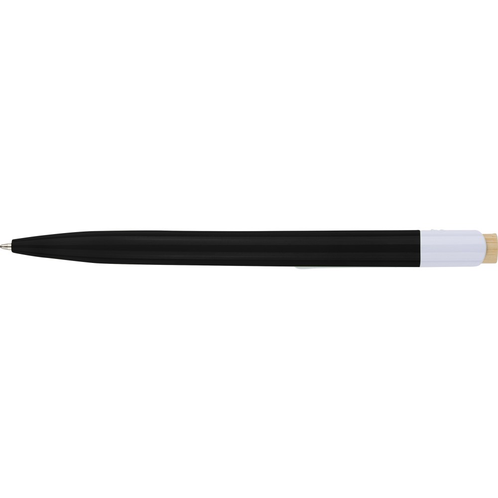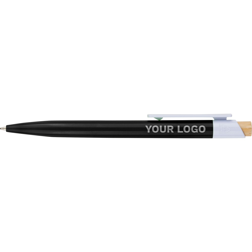 Újrahasznosított ABS-ből készült golyóstoll bambusz nyomógombbal és fehér klippel, digitális nyomtatásra alkalmas kivitelben. A tolltesten fröccsöntés során elhelyezett recycled (újrahasznosított) alapanyagra utaló logó található. Megközelítőleg 600 méter íráshosszúságú, kék színű tollbetéttel. Emblémázás: Tamponnyomás