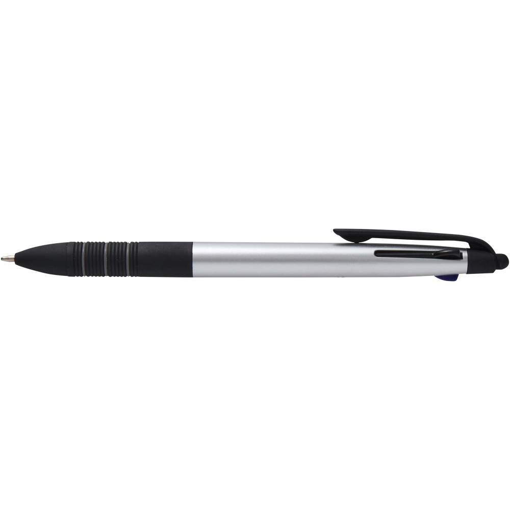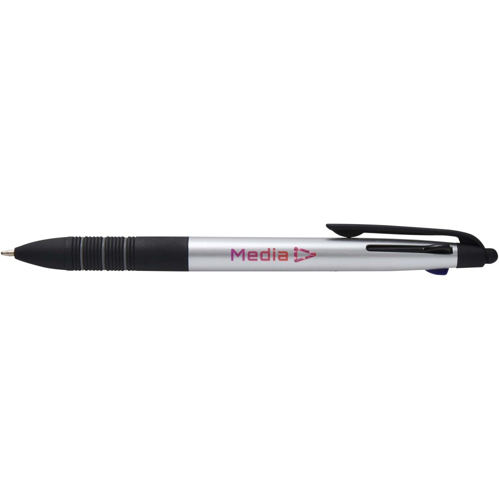 A Trine 3 az 1-ben golyóstoll egy sokoldalú íróeszköz, amely RCS tanúsítvánnyal rendelkező, modern metálbevonatú ABS műanyagból készült, és érintőképernyőköz használható érintővéggel is ellátták. A toll tolómechanizmussal rendelkezik, amellyel könnyedén válthat a fekete, kék és piros tollbetét között. A kényelmes használatot a fekete, csúszásgátló gumival és szürke gyűrűs díszítéssel ellátott ergonomikus markolat biztosítja. Kompakt és funkcionális kialakítása miatt ideális választás jegyzeteléshez, prezentációkhoz vagy digitális felületek kezeléséhez, emellett kiválóan alkalmas emblémázásra is.
