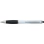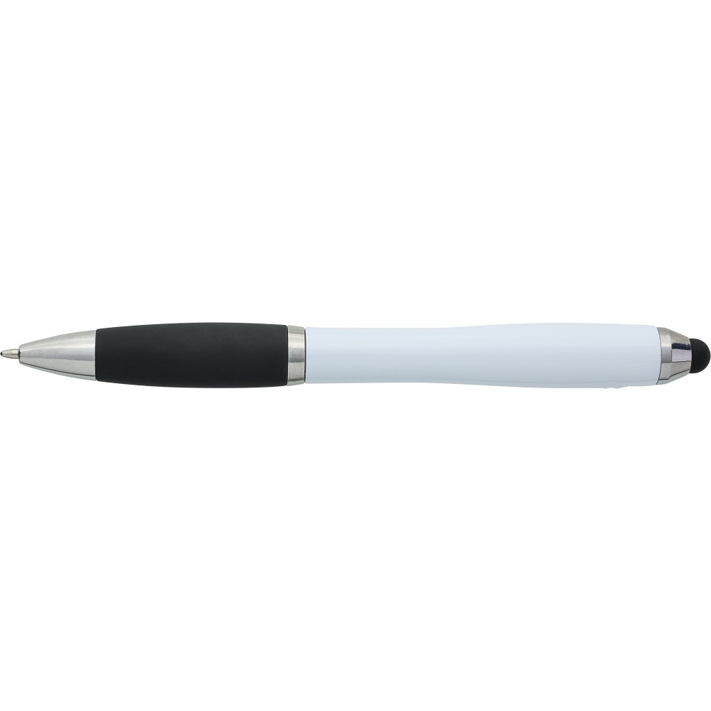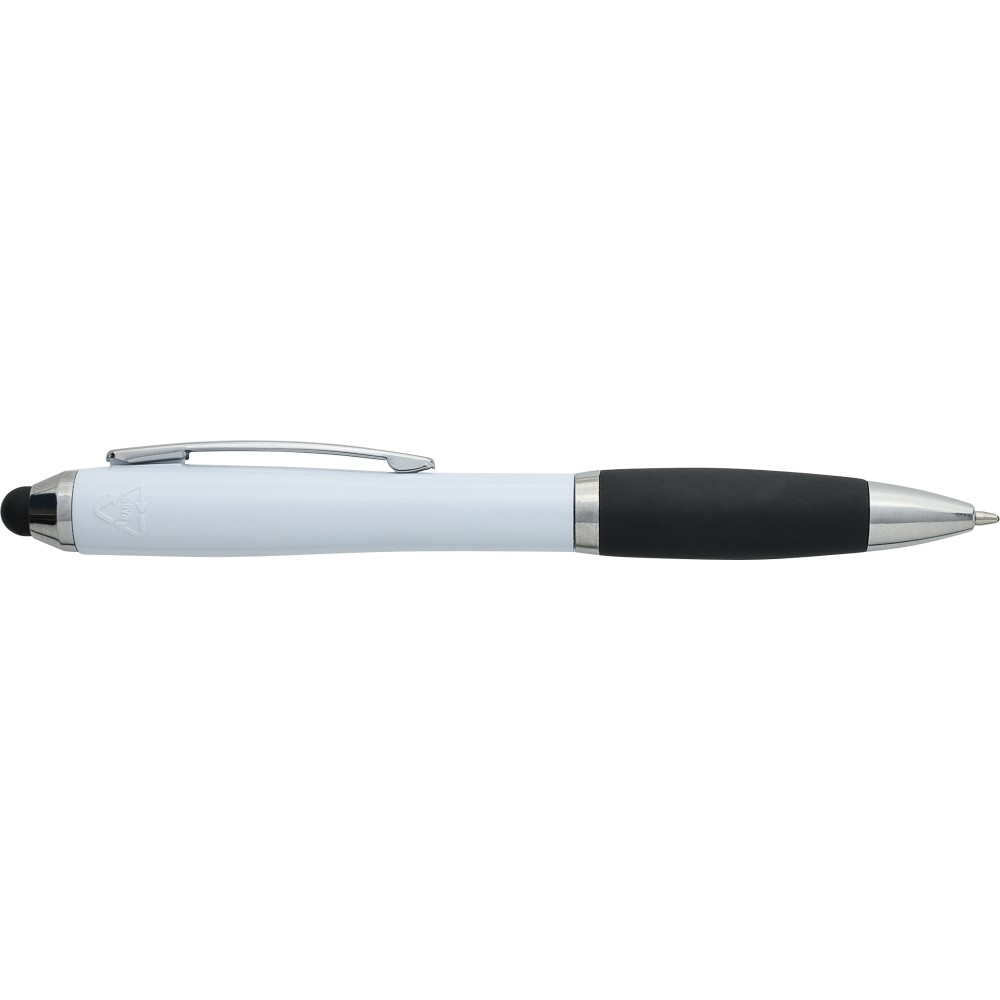 Golyóstoll egyszínű, gumírozott felületű testtel, ezüstszínű kiegészítőkkel és fekete, kapacitív érintőképernyőkhöz használható stylus véggel. Újrahasznosított ABS-ből készült. Nyomógombos szerkezettel, kék tollbetéttel és a tolltesten gravírozott újrahasznosított logóval rendelkezik.