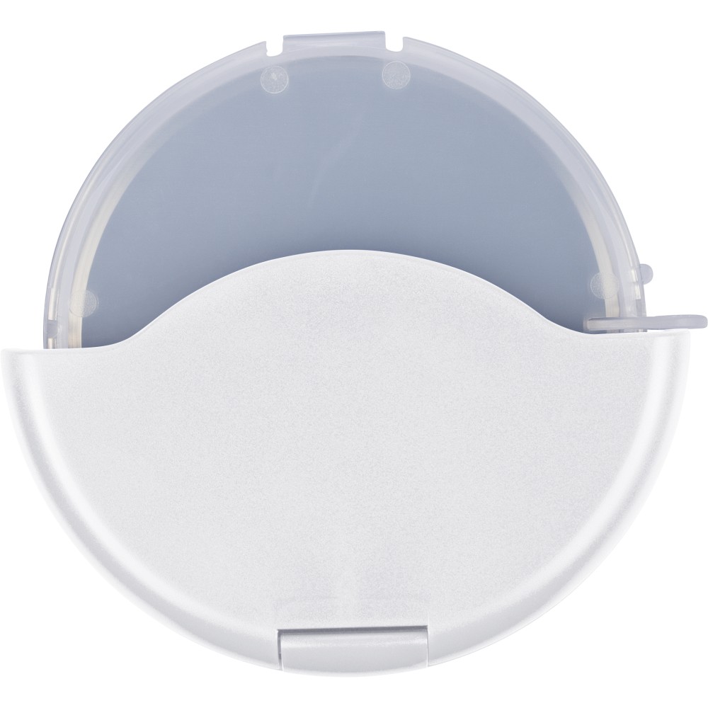 ABS és PP anyagból készült pizzavágó 430-as rozsdamentes acél pengével, kivehető védőborítással, amely könnyen felpattintható a tisztítás és a penge elérése érdekében. Újrahasznosított polietilén tasakba csomagolva. Emblémázás: Tamponnyomás