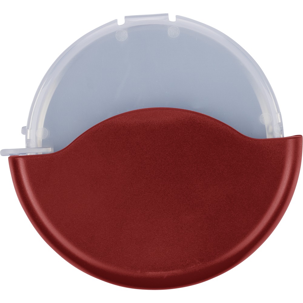 ABS és PP anyagból készült pizzavágó 430-as rozsdamentes acél pengével, kivehető védőborítással, amely könnyen felpattintható a tisztítás és a penge elérése érdekében. Újrahasznosított polietilén tasakba csomagolva. Emblémázás: Tamponnyomás