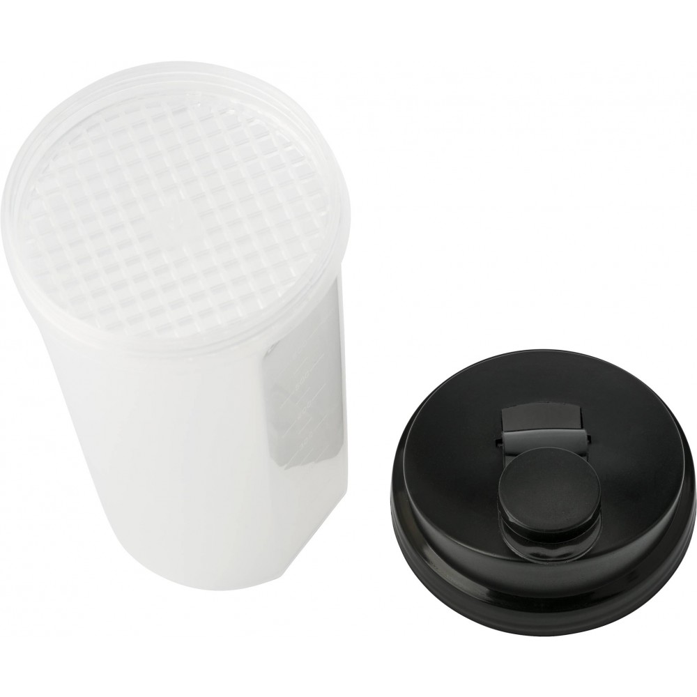 Műanyag protein shaker (kb. 700 ml-es) szűrővel és színes fedéllel, egyik oldalán ml, másik oldalán OZ beosztással. Nem szivárgásmentes. Mosogatógépben nem tisztítható. BPA-mentes műanyag. Emblémázás: Körszita, Tamponnyomás