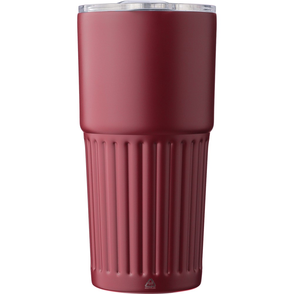 Újrahasznosított rozsdamentes acélból készült, duplafalú ivópohár (500 ml). Belső része 304-es, külső része 201-es rozsdamentes acél, bordázott fogófelülettel. AS fedéllel rendelkezik csúsztatható zárással. A palacktesten gravírozott recycled (újrahasznosított) alapanyagra utaló logó található. Darabonként barna kartondobozba csomagolva. Emblémázás: Körszita