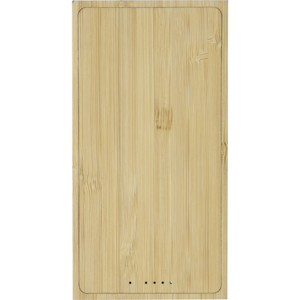 Bambusz napelemes powerbank 10.000 mAh kapacitással, dual USB-A és USB-C porttal, vezeték nélküli töltés funkcióval, beépített napelemes panellel és 5 db LED jelzőfénnyel. 30 cm-es fehér kábel tartozik hozzá. Csomagolása barna papírdoboz. Emblémázás: Gravírozás, Tamponnyomás, UV nyomtatás
