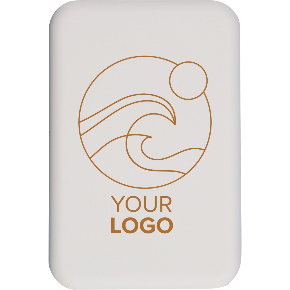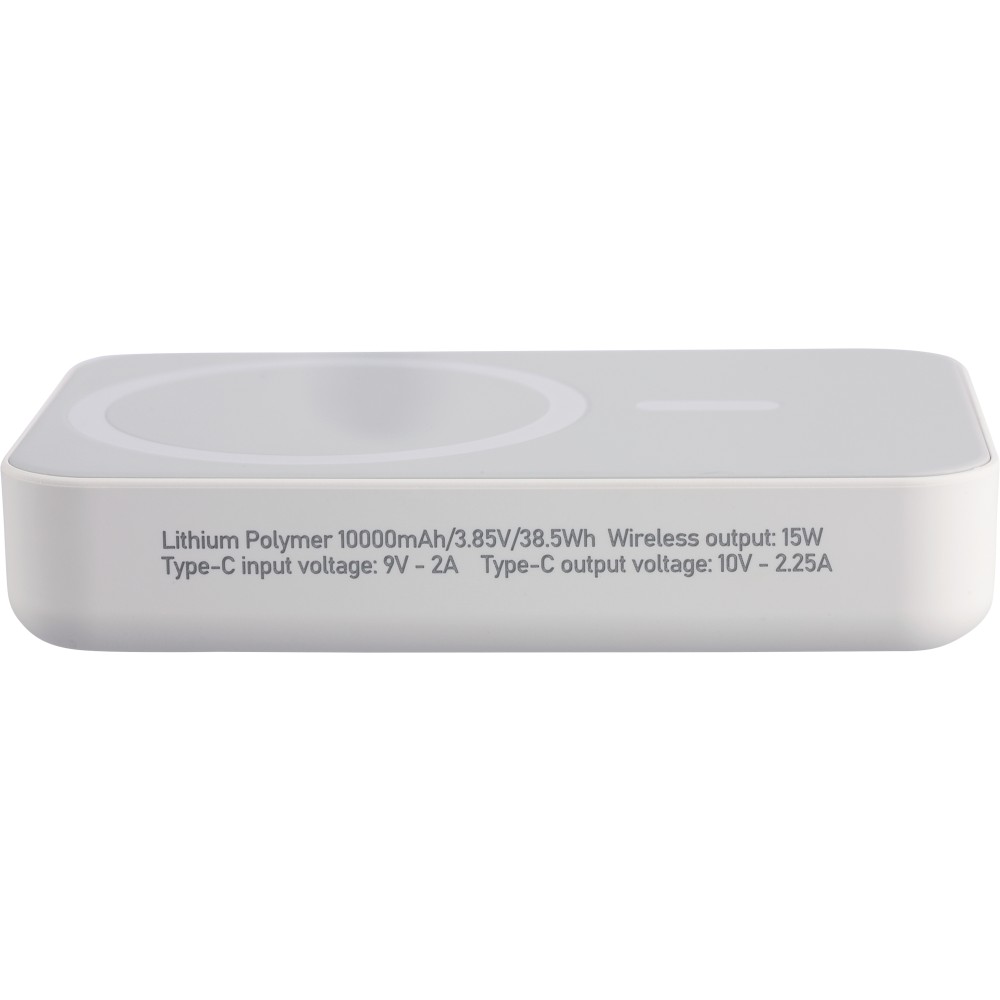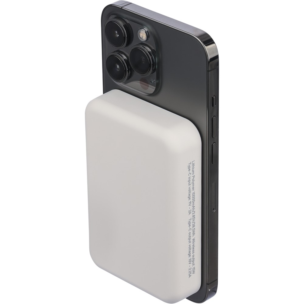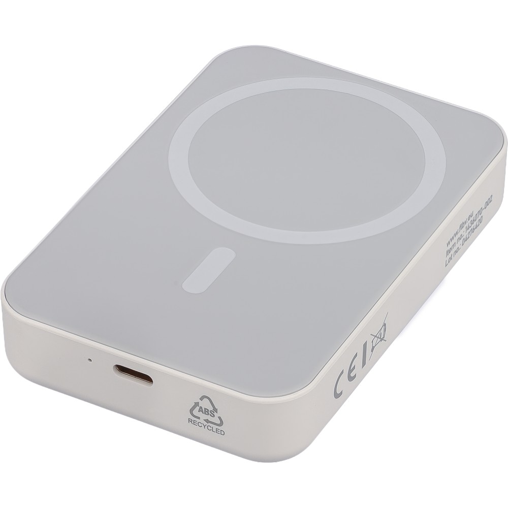 Újrahasznosított, vezeték nélküli powerbank nagy, 10 000 mAh-s kapacitással és 15 W-os vezeték nélküli töltési teljesítménnyel, MagSafe kompatibilitással. Támogatja a Type-C bemenetet és a Type-C kimenetet a hatékony töltés érdekében. A beépített biztonsági funkciók közé tartozik a túlmelegedés, rövidzárlat, túlfeszültség és túláram elleni védelem. Tartozékként egy extra fémgyűrűt és öntapadós hátlapot tartalmaz a nem MagSafe-kompatibilis eszközökkel való használathoz. Barna kartondobozba és selyempapírba csomagolva szállítjuk. Az oldalsó címke tartalmazza a termékinformációkat és az újrahasznosított ABS logót.