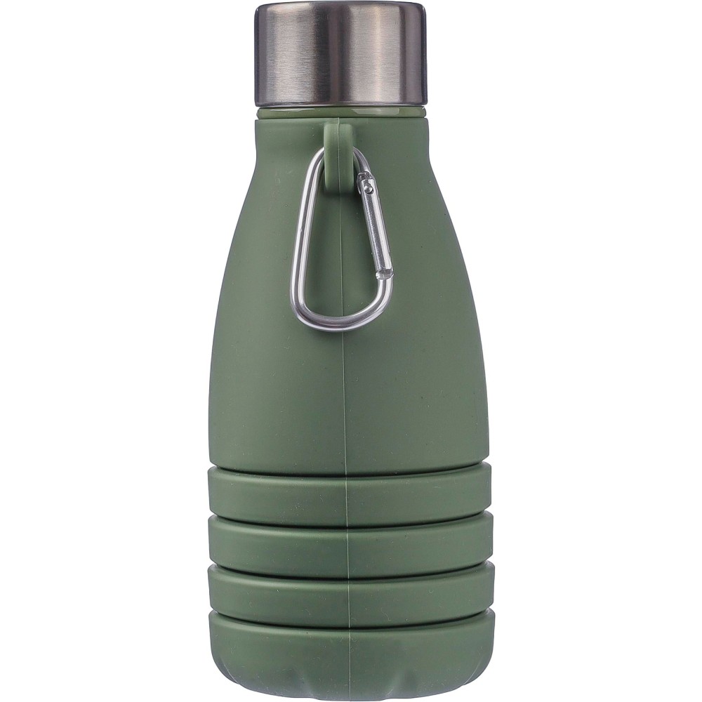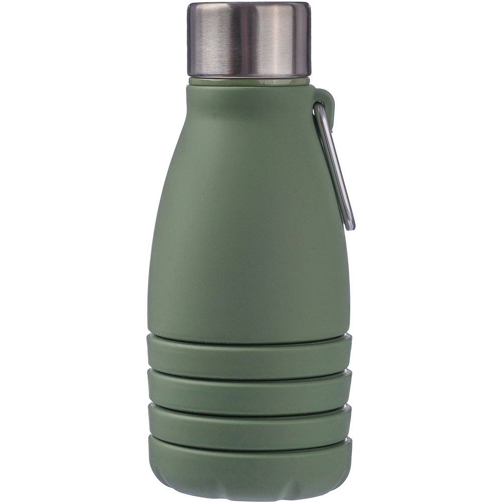 Összecsukható palack rozsdamentes acél fedéllel és alumínium karabinerrel. Összecsukott méret: d: 7x17 cm, kinyitott méret: d: 7x25 cm. Nincs egyenként csomagolva. Anyaga: szilikon. Űrtartalom: 550 ml. Emblémázás: Gravírozás
