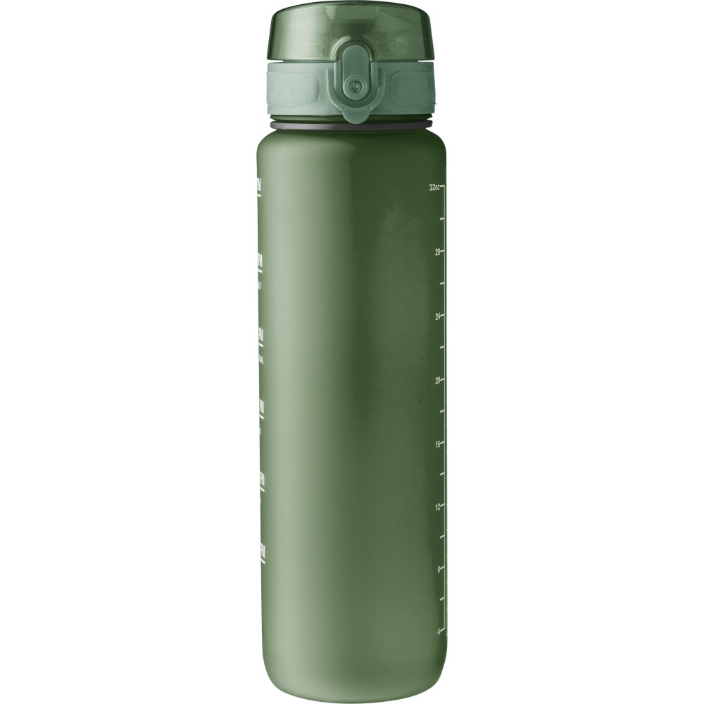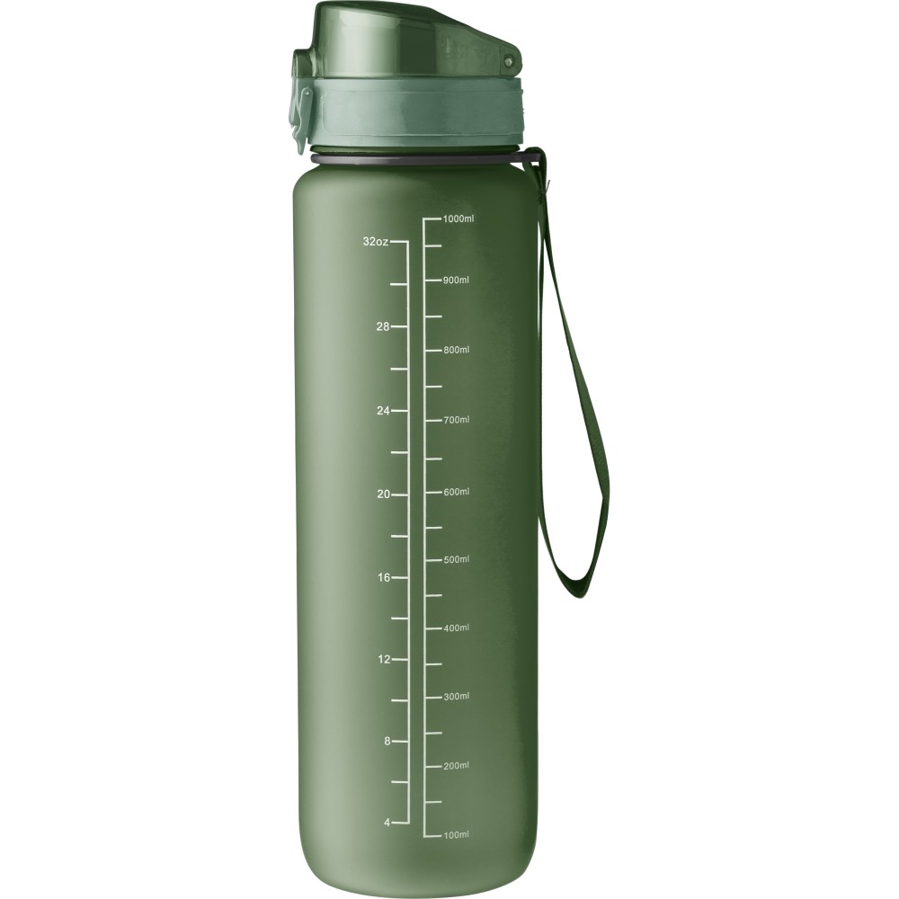 Műanyag motivációs palack szivárgásmentes kupakkal, csuklópánttal, matt bevonattal. Oldalán beosztással. Űrtartalom: 1 liter. Emblémázás: Tamponnyomás, UV nyomtatás