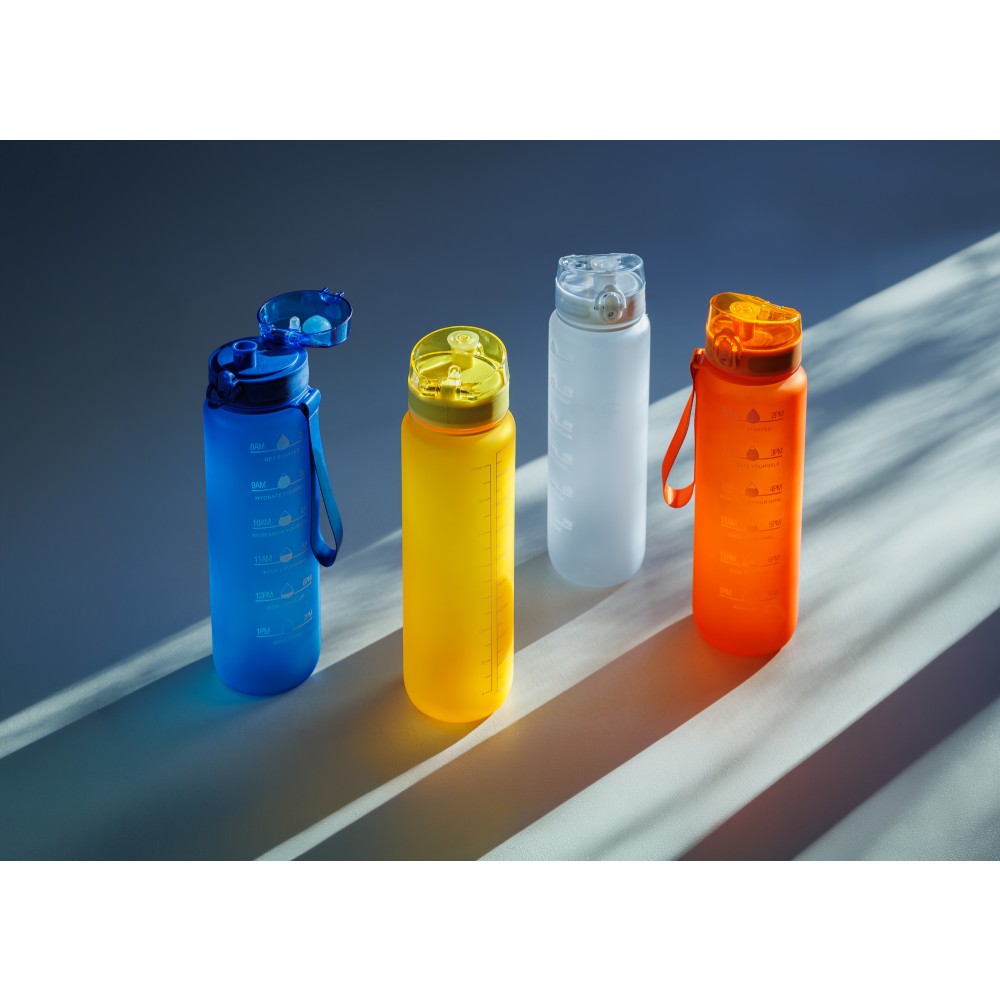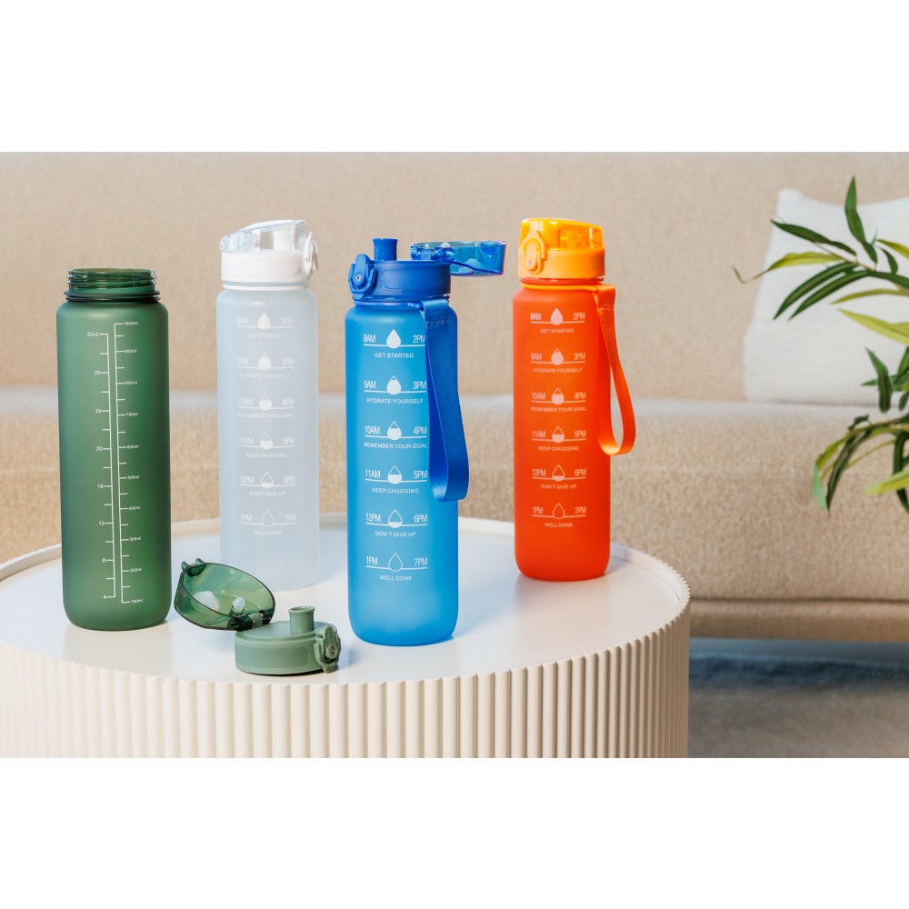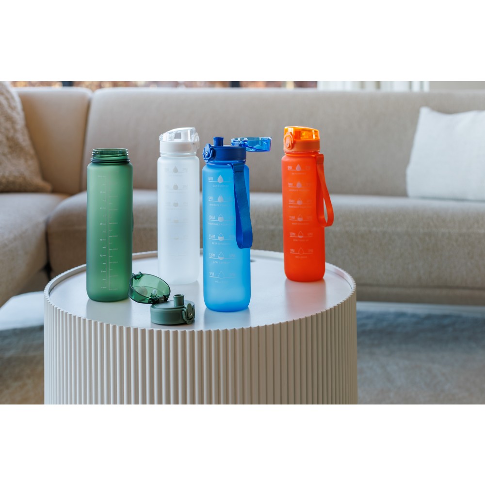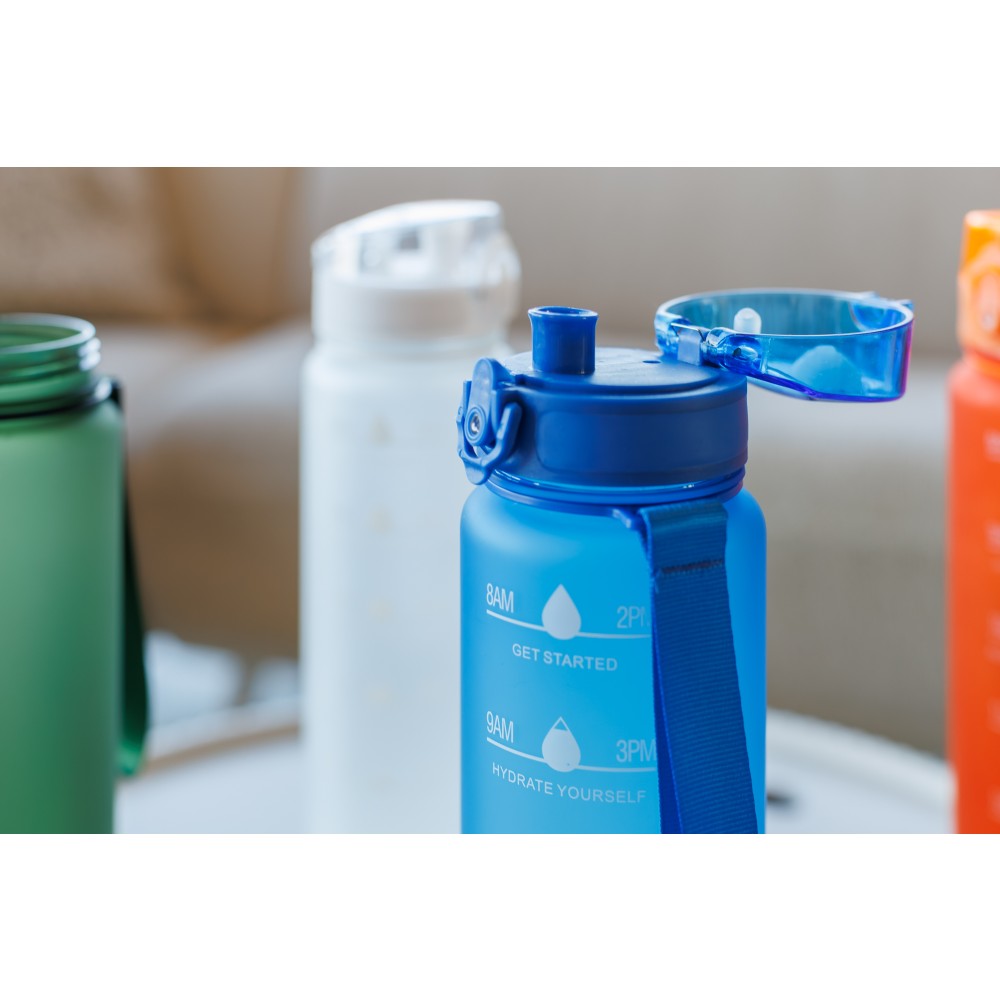 Műanyag motivációs palack szivárgásmentes kupakkal, csuklópánttal, matt bevonattal. Oldalán beosztással. Űrtartalom: 1 liter. Emblémázás: Tamponnyomás, UV nyomtatás