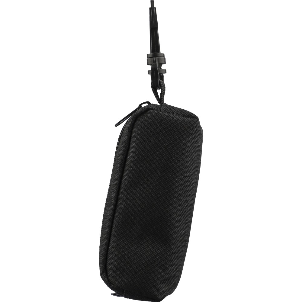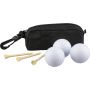 RPET anyagból készült, cipzáras tasakban elhelyezett golfkészlet PP karabinerrel, 3 gyakorló golflabdával és 3 darab bükkfából készült golftee-vel. A tasakon rPET címke található Emblémázás: Szitanyomás