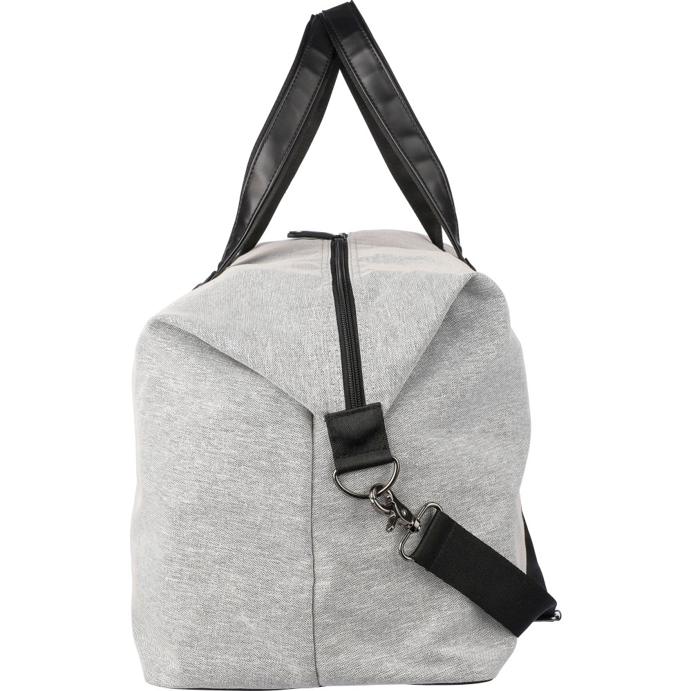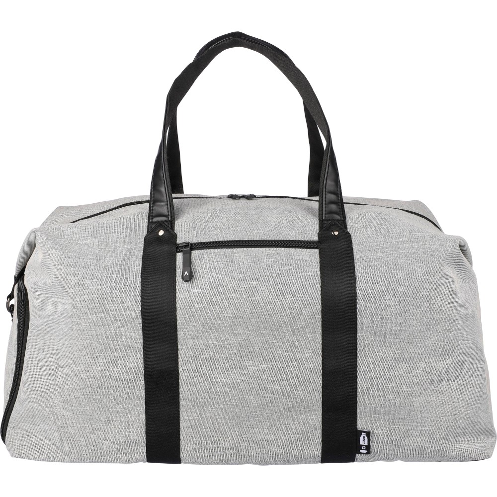 Táska műbőr részletekkel. Belső része 4 mm-es habbal és 1 mm-es PE merevítővel rendelkezik. Tartalmaz egy kis cipzáras rekeszt elöl, egy nagy cipzáras rekeszt és egy oldalsó cipőtartó zsebet. Állítható vállpánttal és két nagy fogantyúval ellátva. Az elülső részen rPET anyagra utaló címke található. Anyaga: 600D újrahasznosított poliészter. Emblémázás: Hímzés