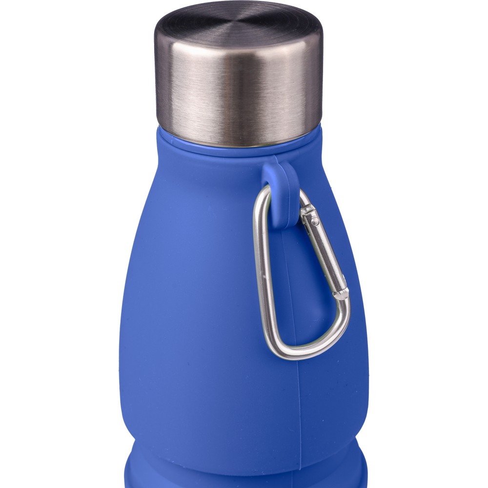 Összecsukható palack rozsdamentes acél fedéllel és alumínium karabinerrel. Összecsukott méret: d: 7x17 cm, kinyitott méret: d: 7x25 cm. Nincs egyenként csomagolva. Anyaga: szilikon. Űrtartalom: 550 ml. Emblémázás: Gravírozás